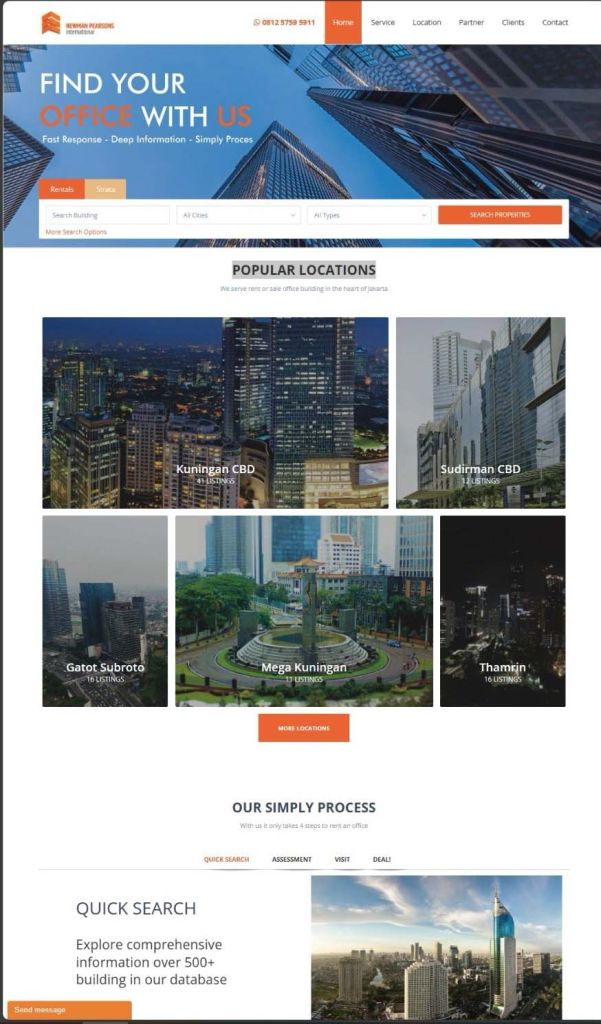 Di bawah bagian POPULAR LOCATIONS, terdapat bagian OUR SIMPLY PROCESS yang menjelaskan proses sederhana untuk menyewa kantor dengan Newman Pearsons International. Proses tersebut hanya membutuhkan empat langkah yaitu QUICK SEARCH, ASSESSMENT, VISIT, dan DEAL!